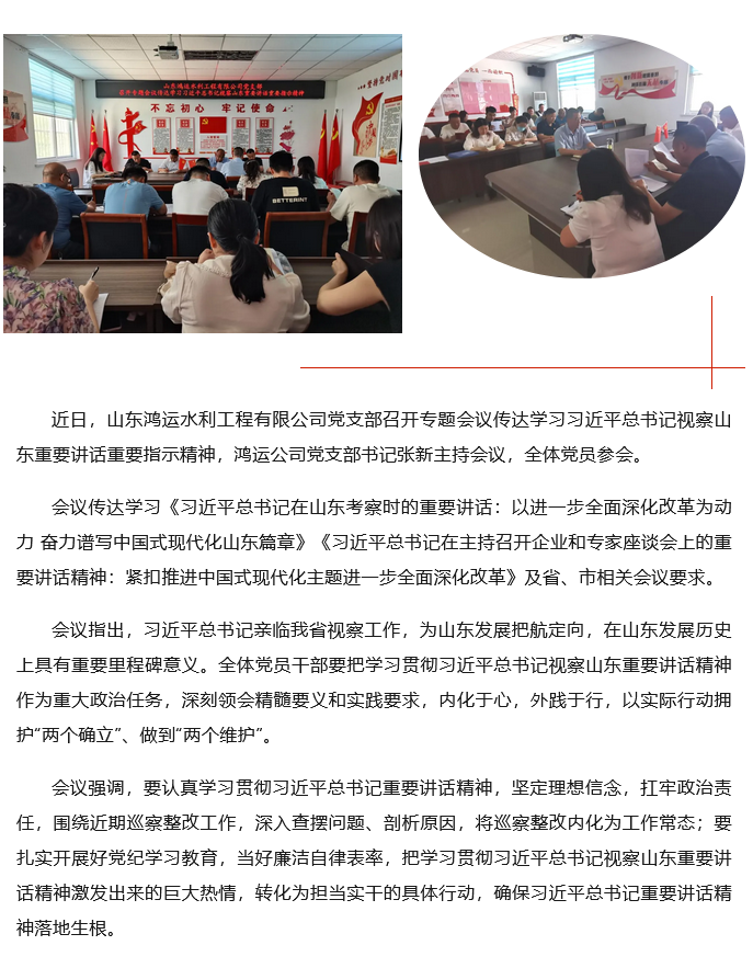 鸿运公司党支部召开专题会议传达学习习近平总书记����� �������Ƴ������������ �������Ƴ�������视察山东重要讲话精神