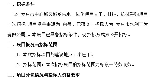 枣庄市中心城区城乡供水一体化项目人工、材料����� �������Ƴ����������� �������Ƴ������������ �������Ƴ�������、机械采购项目二次招标招标公告