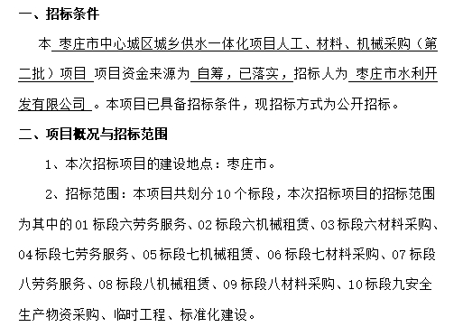 枣庄市中心城区城乡供水一体化项目人工、材料、����� �������Ƴ������������ �������Ƴ�������机械采购(第二批)项目招标公告
