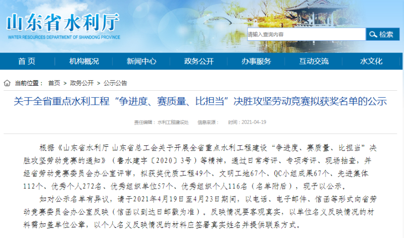 2021年4月19日,山东����� �������Ƴ����������� �������Ƴ����������� �������Ƴ����������� �������Ƴ�������省水利厅网站公示了全省重点水利工程“争进度、赛质����� �������Ƴ������������ �������Ƴ������������ �������Ƴ�������量、比担当”决胜攻坚劳动竞赛拟获奖名单。枣����� �������Ƴ������������ �������Ƴ������������ �������Ƴ�������庄市水利开发有限公司荣获先进集体奖项(峄����� �������Ƴ����������� �������Ƴ������������ �������Ƴ�������城区阴平沙河前张闸除险加固工程项目经理部)、文明����� �������Ƴ������������ �������Ƴ������������ �������Ƴ������������ �������Ƴ�������工地奖项3个(枣庄市市中����� �������Ƴ������������ �������Ƴ������������ �������Ƴ������������ �������Ƴ�������区税郭支流东王庄闸除险加固工����� �������Ƴ������������ �������Ƴ������������ �������Ƴ������������ �������Ƴ�������程、山东省淮河流域重点平原洼地南����� �������Ƴ������������ �������Ƴ������������ �������Ƴ������������ �������Ƴ������四湖片治理工程、山东省湖东����� �������Ƴ����������� �������Ƴ�������滞洪区建设工程)、QC小组成果����� �������Ƴ������������ �������Ƴ������������ �������Ƴ�������奖项(东王庄闸闸坝闸室段混凝土施工QC小组)、����� �������Ƴ������������ �������Ƴ�������优秀个人奖项(高级工程师连永)����� �������Ƴ������������ �������Ƴ����������� �������Ƴ������������ �������Ƴ������。
