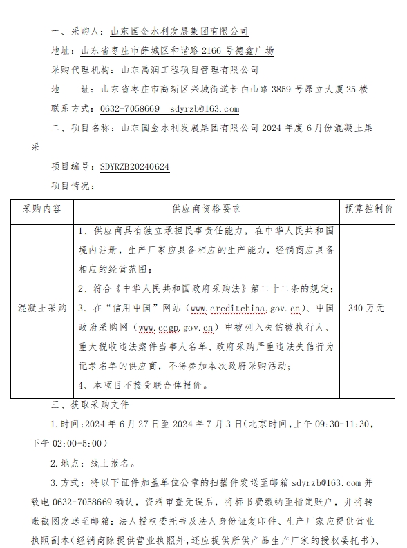 山东国金水利发展集团有限公司2024年度6����� �������Ƴ������������ �������Ƴ������月份混凝土集采采购公告