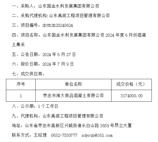 山东国金水利发展集团有限公司2024年度����� �������Ƴ������������ �������Ƴ������������ �������Ƴ������������ �������Ƴ�������6月份混凝土集采成交公告